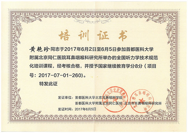 國家認證三級助聽器驗配師,從事助聽器選配工作13年,工作至今,多次參加公司組織的技能培訓,已獲得瑞士峰力、美國斯達克、加拿大優利康、丹麥瑞聲達等公司的專業驗配資格證書。已為小至6個月的嬰兒,大至97歲的老人家成功選配助聽器,具備豐富的助聽器驗配經驗,在耳聾病因分析、助聽器驗配調試、聽力語言康復訓練及聾兒助聽器選配方面有著豐富的實踐經驗,目前從事聽力檢測及聽力評估,多品牌助聽器的選配及調試,聽力語言康復及心理指導,聾兒助聽器選配及后期調試等工作。